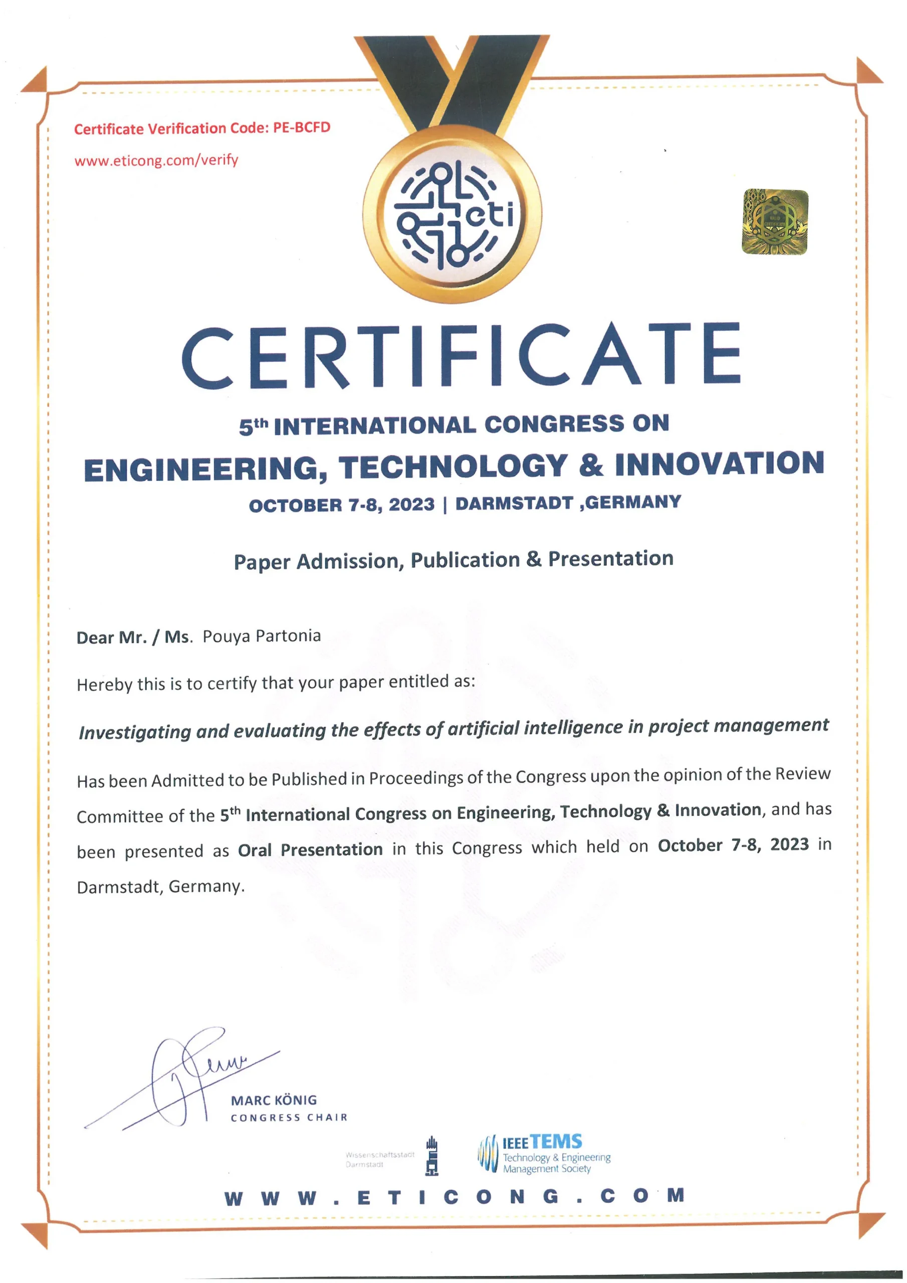 Certificates of Accepted Papers in National and International Scientific Conferences